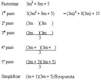 Se identifica por tener tres términos, hay una literal con exponente al cuadrado y uno de ellos es el término independiente. Se resuelve por medio de dos paréntesis, en los cuales se colocan la raíz cuadrada de la variable, buscando dos números que multiplicados den como resultado el término independiente y sumados (pudiendo ser números negativos) den como resultado el término del medio. Ejemplo: